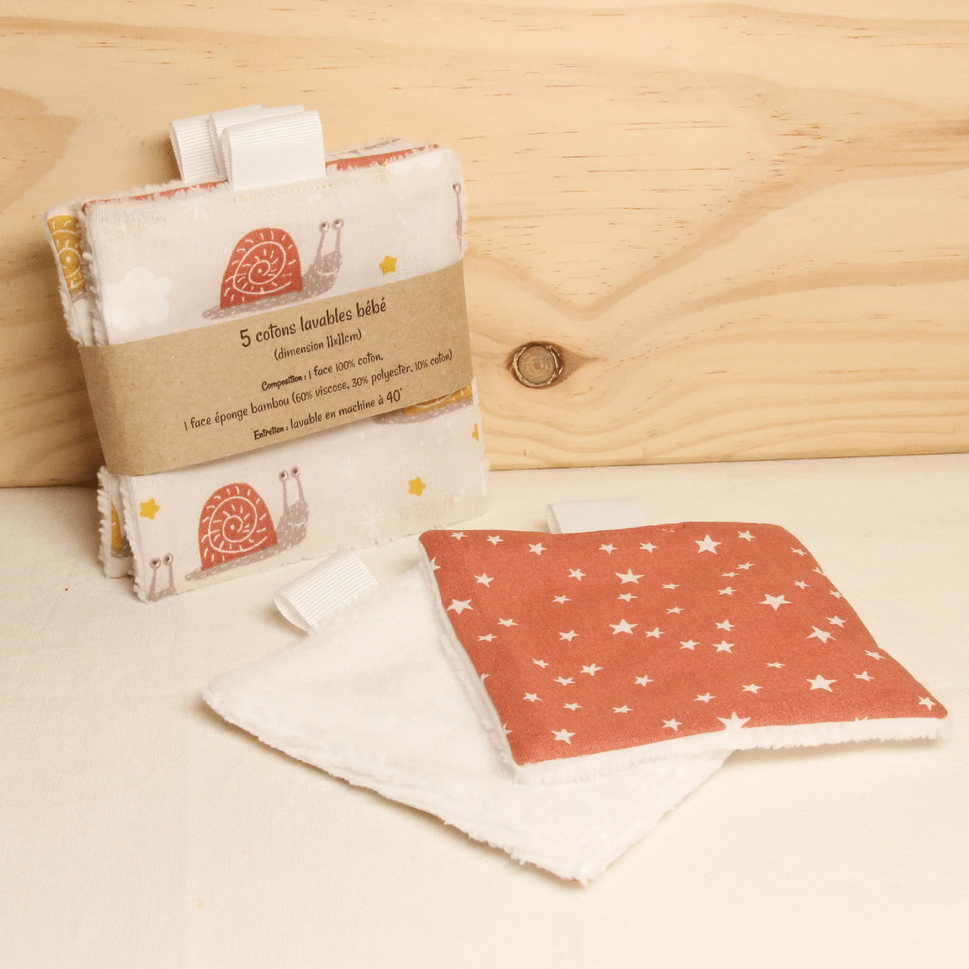 Ces lingettes sont composées d’un côté d’un tissu coton imprimé et de l’autre côté (côté à utiliser pour essuyer votre enfant) de tissu bambou, tissu très doux et spécialement conçu pour ce type d’usage.