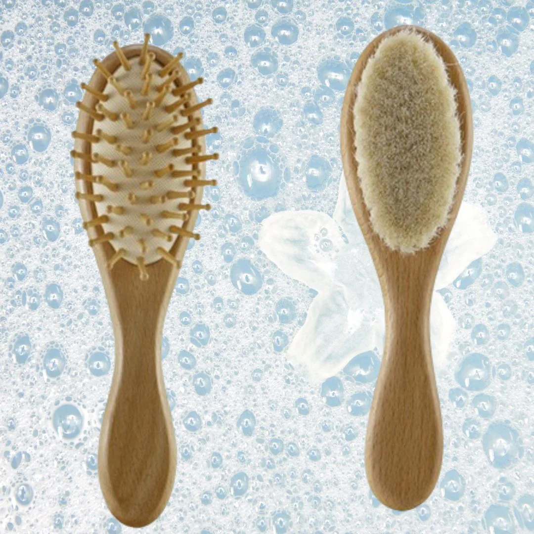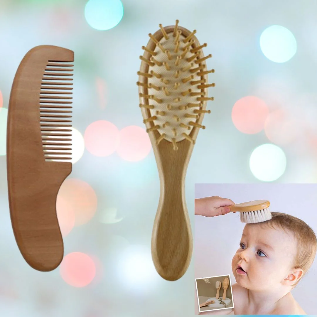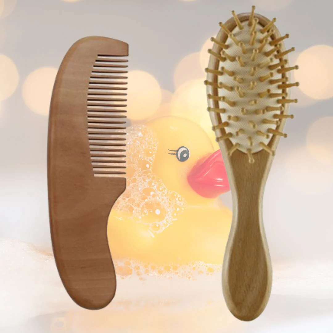 Voici le parfait compagnon pour le rituel du bain ou après le bain de votre bébé : le Peigne, Brosse et Masseur de Tête en bois pour nouveau-né et enfant.